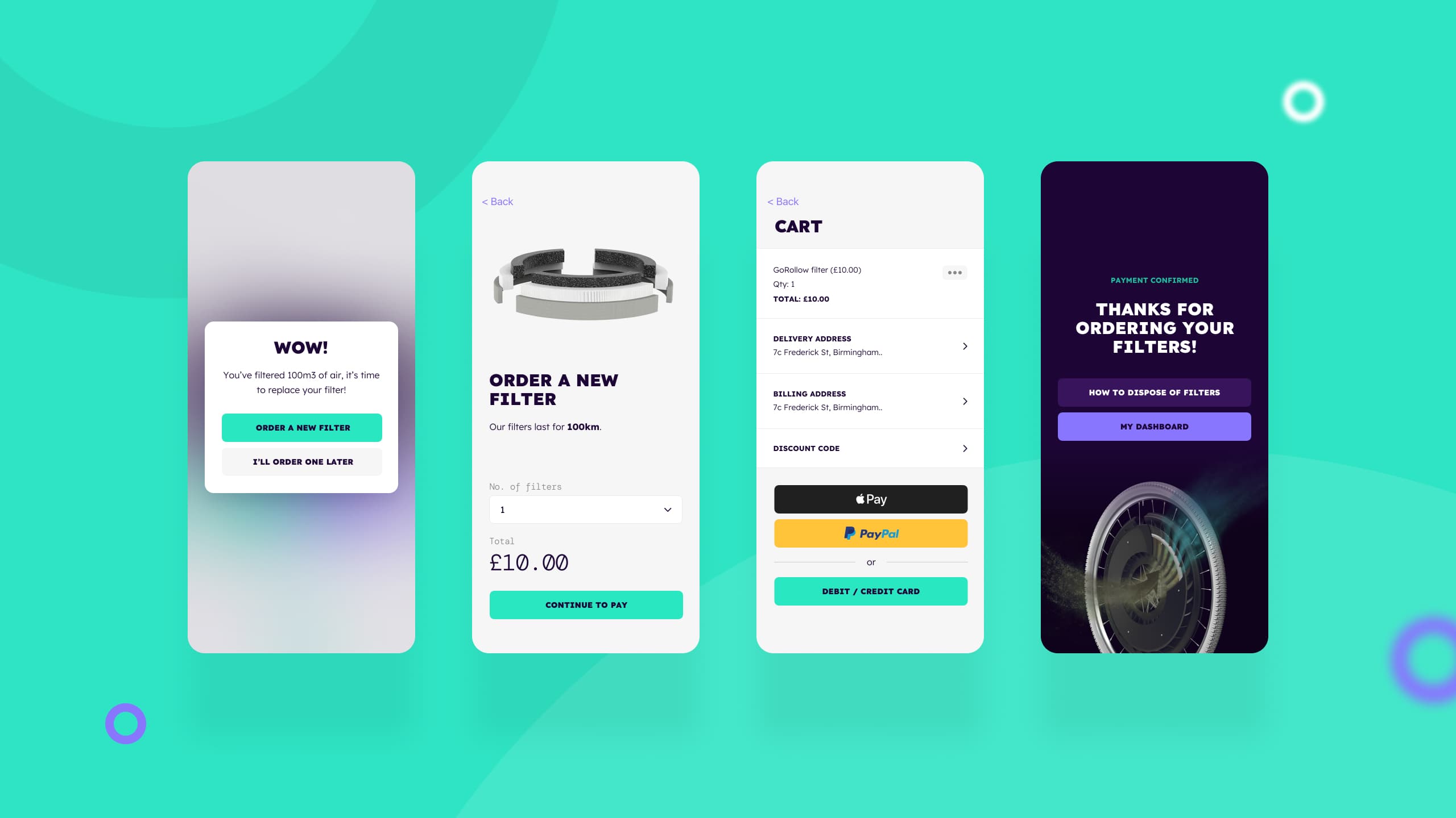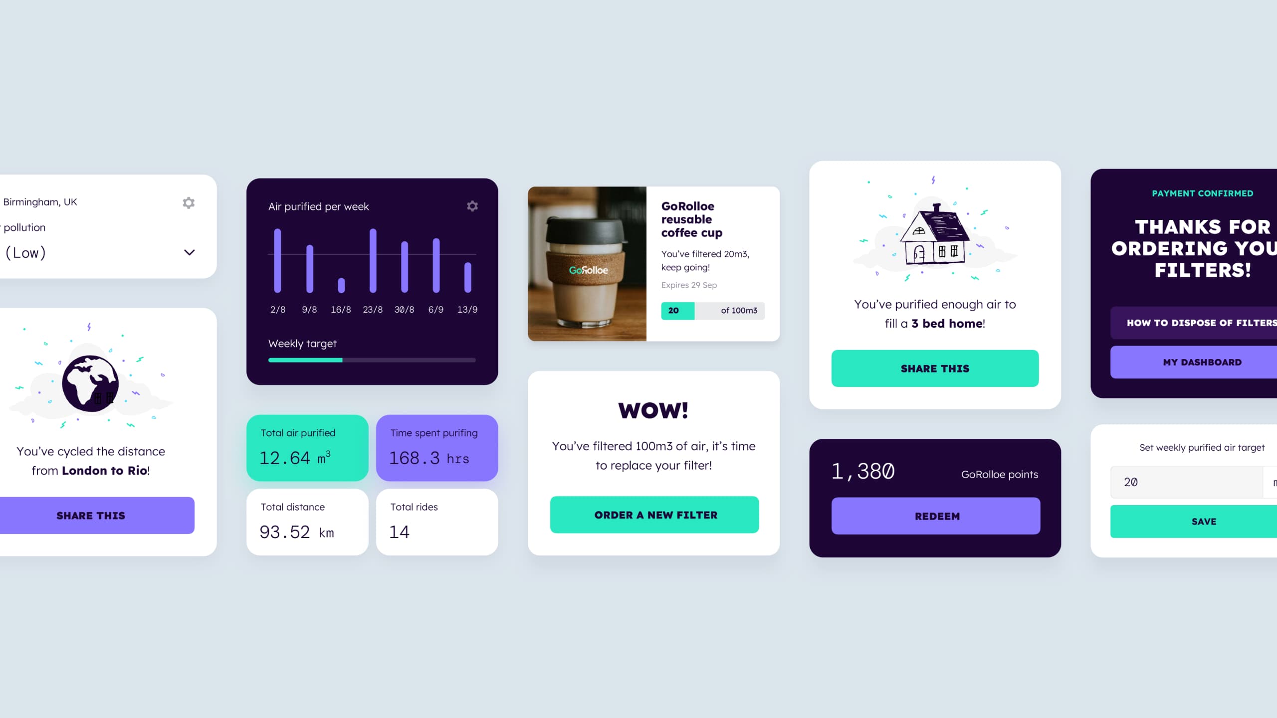 With a view to making cutting air pollution a fun challenge, we mapped out core features of the app centered around user stats and gamification. Usage stats needed to be presented in a clear and familiar way – with our target audience being well-versed in the likes of fitness tracking, they would be used to stats at-a-glance. The gamification functionality would see users trading in their m3’s of air filtered as “points” to claim rewards. Finally, we scoped out the e-commerce element – enabling users to order new filters for the GoRolloe product from right within the app.