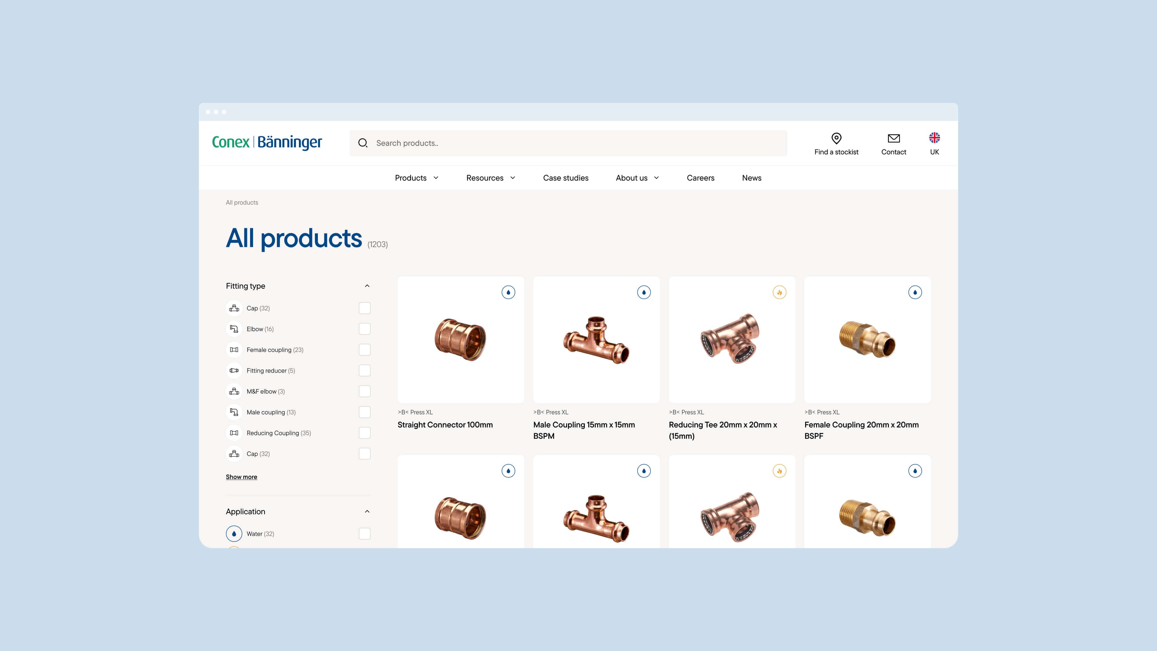 Conex Bänninger customers encompasses industry professionals, installers and distributors across a range of sectors, with differing levels of expertise. Not every user who lands on the site will know exactly what they’re looking for. We built a product selector which would enable the user to select the application, then set pressure, temperature and fitting type in order to suggest the right product for their project without them having to have in-depth knowledge of the range.