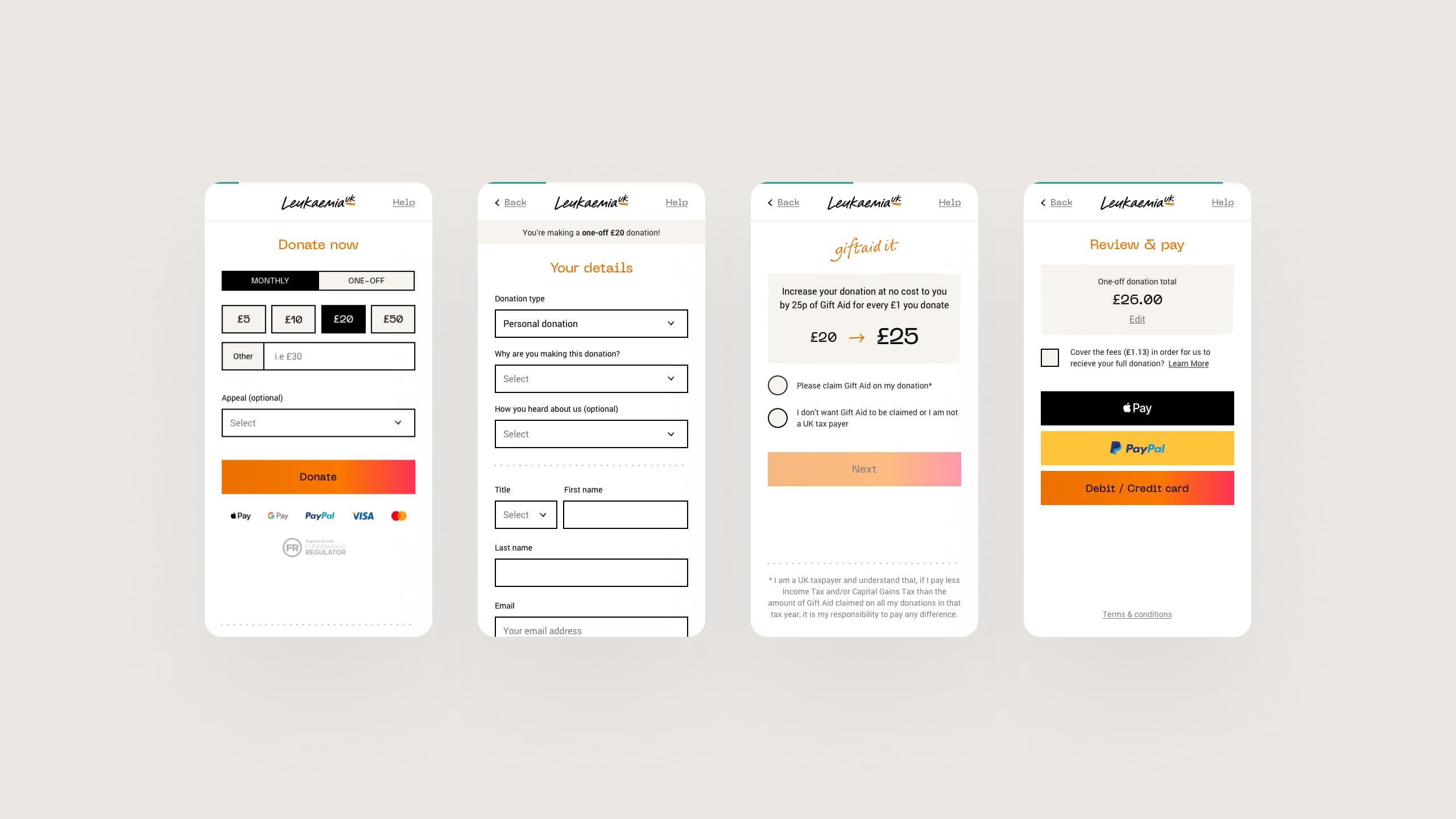 Income from donations is obviously key to enabling Leukaemia UK to continue their vital work. We designed the donations funnel to be simple, usable and accessible so that people can make a donation in just a few clicks. Early on in the process, we identified the need to host donations on a dedicated CMS away from the main content, meaning fewer technical limitations, fewer bottlenecks and an all-around improved experience for people generous enough to donate.