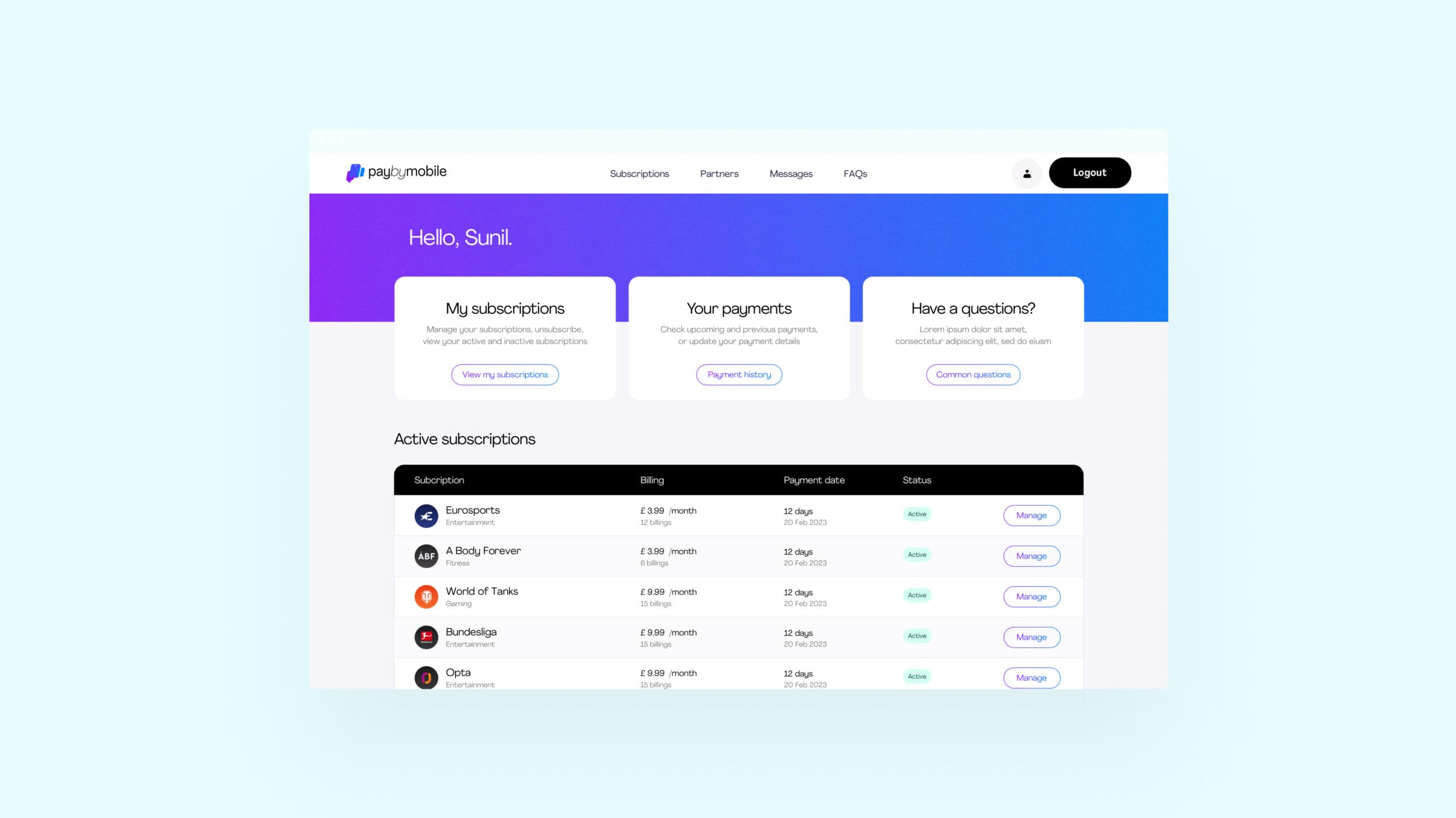 Paybymobile connects users in emerging markets with in-demand content, so it’s vital that it’s easy for users to view and manage their subscription. We mapped the customer journeys across the two disparate portals and brought them into a single portal – enabling complete control and visibility over subscriptions and account information all in one place.