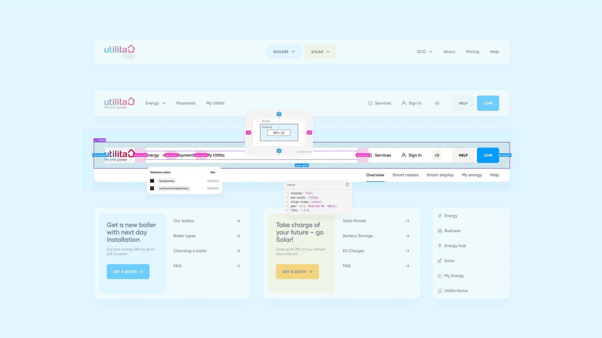 Our designers created a master style guide, within Figma, encompassing the components we’d created, allowing for responsiveness, variants and outlining key properties. The style guide documents and presents global styles across colour, typography, buttons and other visual elements, creating one source of truth for Utilita’s digital visual identity. It also establishes a consistent naming convention so components can be easily and quickly identified and utilised by us or Utilita’s internal engineering team.